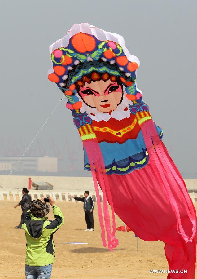 A participant flies a kite during a kite fair held in Weifang, east China's Shandong Province, April 11, 2015. A total of 85 teams from all over the Weifang city took part in the fair on Saturday. (Xinhua/Zhang Chi)