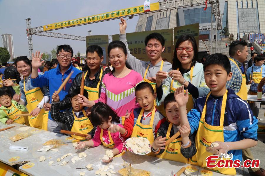 A total of 17,000 people simultaneously make dumplings while watching a cooking class video in 18 places in North China’s Henan province, April 12, 2015. With 4613 participants passing the challenge in the 50-minute long class, it set a Guinness World Record for the largest cooking class. The previous record involved 3,687 people making dumplings in Qingdao, Shandong province, February 14, 2015. (Photo: China News Service/Wang Zhongju)