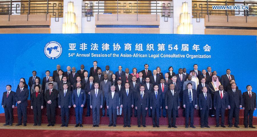 Chinese Premier Li Keqiang (C, front) and other delegates pose for a group photo before the opening of the 54th annual session of the Asian-African Legal Consultative Organization (AALCO) in Beijing, capital of China, April 13, 2015. (Xinhua/Wang Ye)