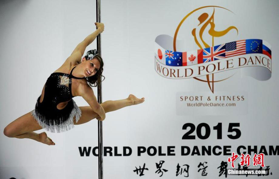 The semifinals of 2015 World Pole Dance Championships is held in China pole dance training centre on April 11, 2015. In the finals held in Beijing last Sunday, 43 contestants from 14 countries competed for singles and doubles titles. The top-notch pole dance competition was held in Asia for the first time.(Photo/Chinanews.com)
