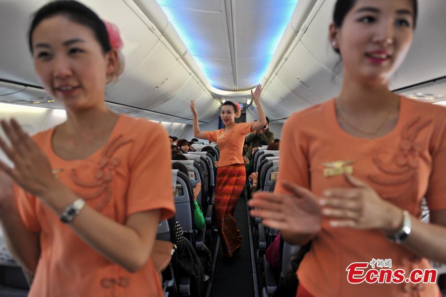 Flight attendants, donned in ethnic Dai traditional costume, splash water on passengers on a flight from Taiyuan to Kunming, Southwest China's Yunnan province, April 13, 2015. The annual water-sprinkling festival kicked off on Sunday. (Photo: China News Service/Ren Dong)