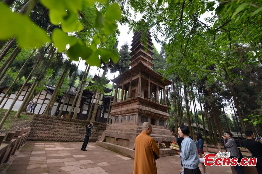 | A group of investigators, including Buddhists and archaeologists, inspect a stone pagoda in Qionglai city, Southwest China’s Sichuan province, April 13, 2015. Sources say sarira of Sakyamuni, relics of the Buddha after cremation, is stored in the 800-year-old building. (Photo: China News Service/Zhang Lang) |