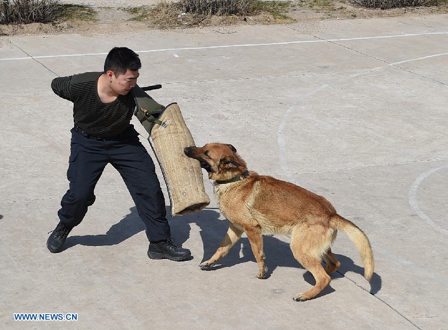 A trainer trains a police dog in biting at a police dog training base in Hohhot, capital of north China's Inner Mongolia Autonomous Region, April 14, 2015. There are over 130 dogs and 16 trainers at the police dog training base of the Public Security Department of Inner Mongolia. 30 of the dogs at the base can perform tasks like drug searching and explosive safety inspection. Each of the trainer trains dogs for four hours everyday, and other time they feed them, play with them to build up relationships with the dogs. (Xinhua/Shao Kun)