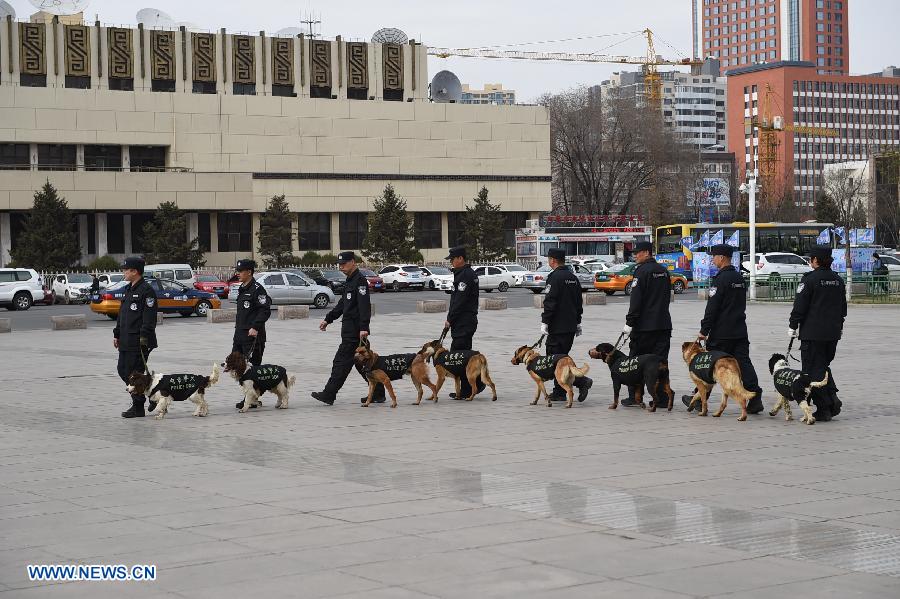 Trainers and dogs patrol in the city of Hohhot, capital of north China's Inner Mongolia Autonomous Region, April 14, 2015. There are over 130 dogs and 16 trainers at the police dog training base of the Public Security Department of Inner Mongolia. 30 of the dogs at the base can perform tasks like drug searching and explosive safety inspection. Each of the trainer trains dogs for four hours everyday, and other time they feed them, play with them to build up relationships with the dogs. (Xinhua/Shao Kun)