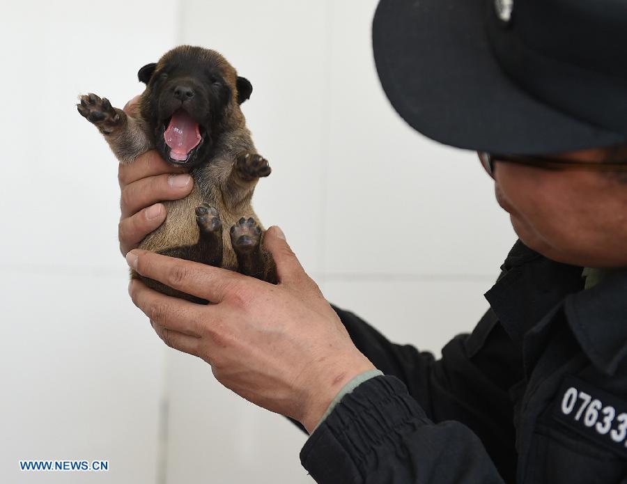 A trainer holds a newborn puppy at a police dog training base in Hohhot, capital of north China's Inner Mongolia Autonomous Region, April 14, 2015. There are over 130 dogs and 16 trainers at the police dog training base of the Public Security Department of Inner Mongolia. 30 of the dogs at the base can perform tasks like drug searching and explosive safety inspection. Each of the trainer trains dogs for four hours everyday, and other time they feed them, play with them to build up relationships with the dogs. (Xinhua/Shao Kun)