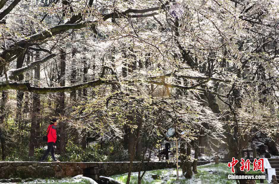 Located in east China’s Anhui province, Mount Huangshan have been bathed in spring sunshine for a while. However, a spring snow turned this famous tourist site into an ice world on April 9, 2015. (Chinanews/Yao Yuqing)