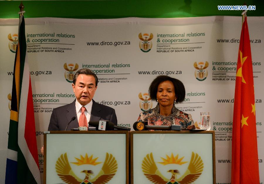 | Visiting Chinese Foreign Minister Wang Yi (L) and Maite Nkoana-Mashabane, Minister of the Department of International Relations and Cooperation of South Africa, attend a press conference following their meeting in Pretoria, South Africa, on April 14, 2015. (Xinhua/Zhai Jianlan) |
