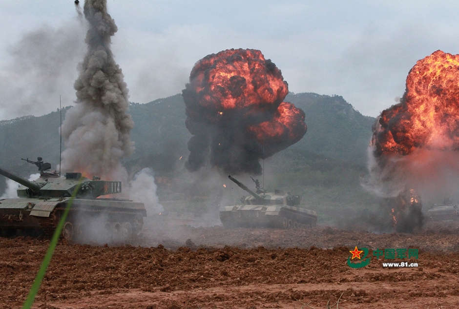 The Type 96A tanks get through the gunfire blockade zone of the "enemy" and move forward. On April 12, 2015, an armored regiment under the Nanjing Military Region of the People's Liberation Army (PLA) held training under the combat environment to temper soldiers’ combat skills and fighting spirit as well as to improve the emergency response ability. (Photo source: 81.cn)
