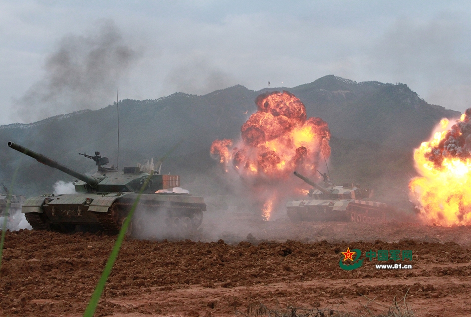 The Type 96A tanks get through the gunfire blockade zone of the "enemy" and move forward. On April 12, 2015, an armored regiment under the Nanjing Military Region of the People's Liberation Army (PLA) held training under the combat environment to temper soldiers’ combat skills and fighting spirit as well as to improve the emergency response ability. (Photo source: 81.cn)