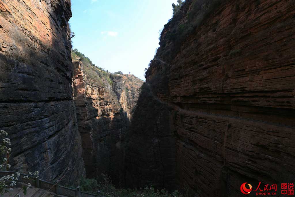 Jiyi Canyon, a natural wonder, lies high above the turbulent Daliang River in Wuding county, southwest China's Yunnan province. It is 12 kilometers long, 200 meters at its widest, 6 meters at its narrowest and 300 meters at its deepest point. (Photo/People.cn)