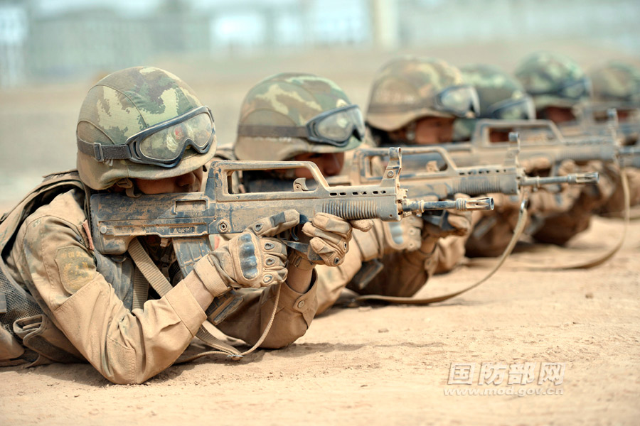 The “Lijian Commando”of Xinjiang Border Defense Corps conducts live fire training in Gobi desert on April 9, 2015. (Photo source: mod.gov.cn)
