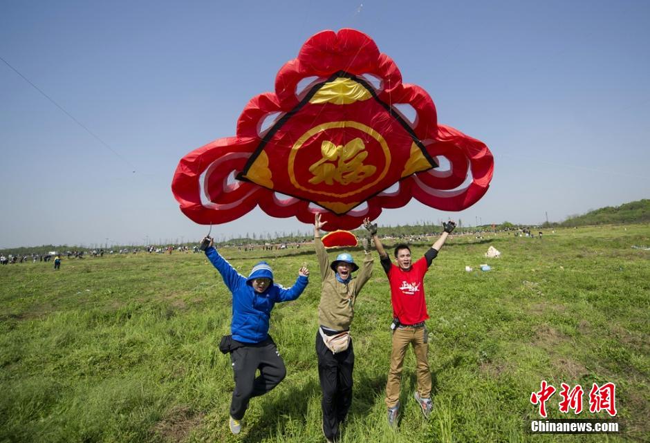 | The huge Chinese-knot-shaped kite flies with three small sheep hanging on it in Changsha city, capital of Hunan province. (CNS/Yang Huafeng) |