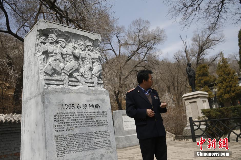 Yang introduces a sculpture commemorating the Jingzhang Railway and a bronze statue of Zhang Tianyou, the designer of Jingzhang Railway. (Chinanews/Zhang Hao)