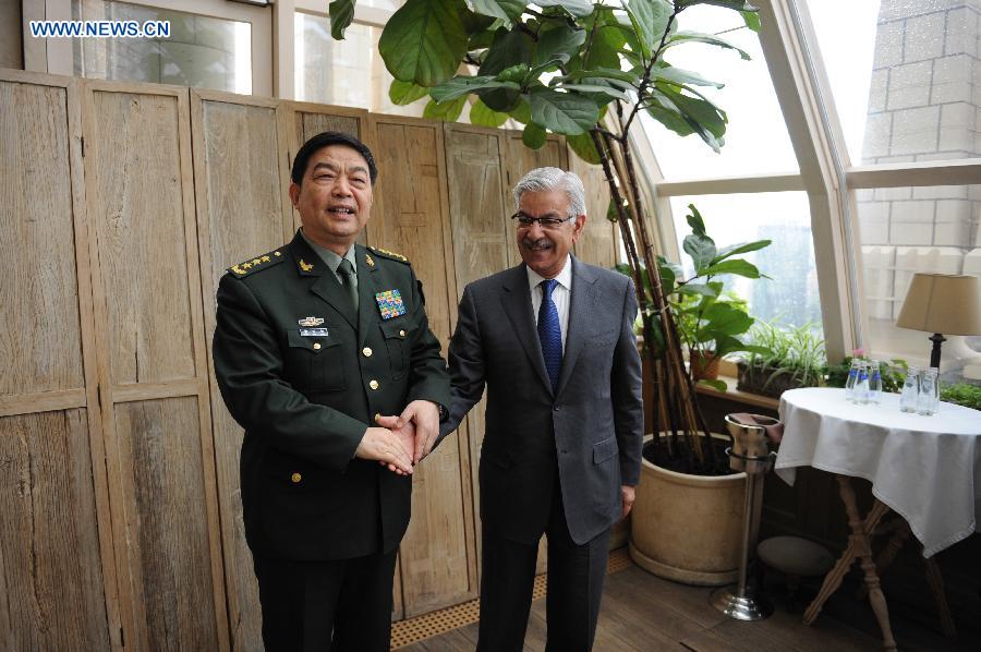 Chinese State Councilor and Defense Minister Chang Wanquan (L) meets with Pakistani Defense Minister Khawaja Asif attending the 4th Moscow International Security Conference inRussia, on April 16, 2015. (Xinhua/Dai Tianfang)