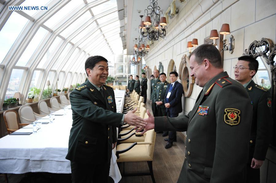 Chinese State Councilor and Defense Minister Chang Wanquan (L) meets with Belarusian Defence Minister Andrei Ravkov (R, front) attending the 4th Moscow International Security Conference inRussia, on April 16, 2015. (Xinhua/Dai Tianfang)