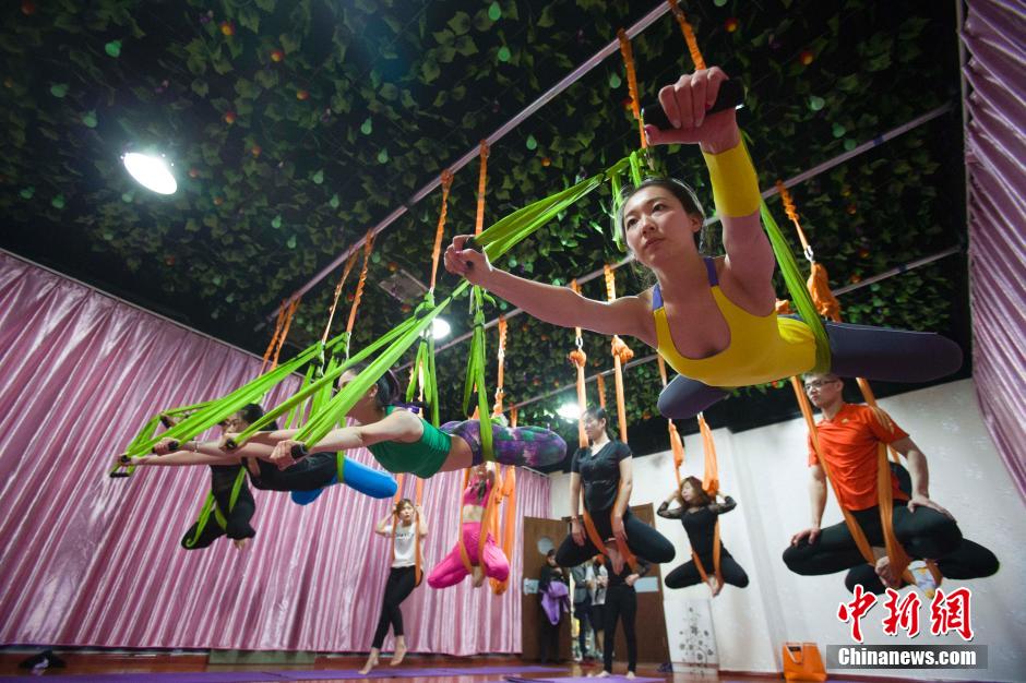 In this photo taken on April 14, 2015, several yoga fans practice "yoga in the air". Recently, "air yoga" or "anti-gravity yoga" has become popular in Taiyuan, capital city of north China's Shanxi province. People perform yoga poses in a trapeze that is suspended from the ceiling. (CNS/Zhang Yun)