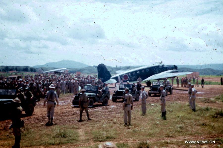 The file photo taken on August 21, 1945 by U.S. veteran Joe Day shows the Japanese representatives in cars with white flag on their way to surrender after landing at the airport in Zhijiang County, central China's Hunan Province. A museum in Zhijiang Dong Autonomous County of Hunan Province debuted 32 color photos on April 17, 2015 that documented Japan's surrender in the province in August 1945. They were among 223 photos of the Chinese Anti-Japanese War donated last November by Joe Day, a member of the Flying Tigers, the 1st American Volunteer Group formed in 1941 to help China drive out invading Japanese troops. On August 21-23, 1945, Japanese representatives fled to Zhijiang, handed over a map of Japanese troops deployed in China and signed a surrender memorandum. (Xinhua)