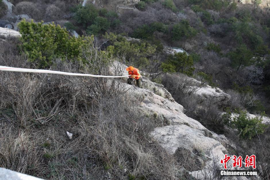 A cleaning worker collects garbage on precipice in wind in Laojunshan Mountain of Luoyang, central China’s Henan province on April 16, 2015. Having a rope tied on the waist, the worker climbed under a suspended plank road 2000 meters high, just like a Spider Man. (Chinanews/Wang Zhongju)