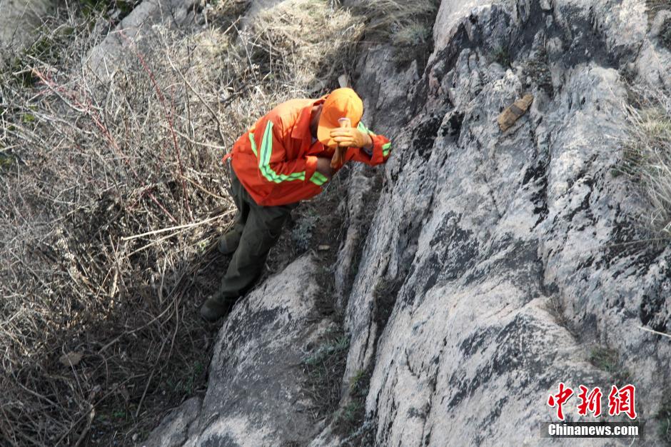 A cleaning worker collects garbage on precipice in wind in Laojunshan Mountain of Luoyang, central China’s Henan province on April 16, 2015. Having a rope tied on the waist, the worker climbed under a suspended plank road 2000 meters high, just like a Spider Man. (Chinanews/Wang Zhongju)