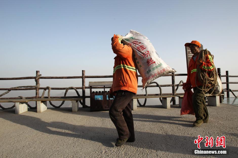 | A cleaning worker collects garbage on precipice in wind in Laojunshan Mountain of Luoyang, central China’s Henan province on April 16, 2015. Having a rope tied on the waist, the worker climbed under a suspended plank road 2000 meters high, just like a Spider Man. (Chinanews/Wang Zhongju) |