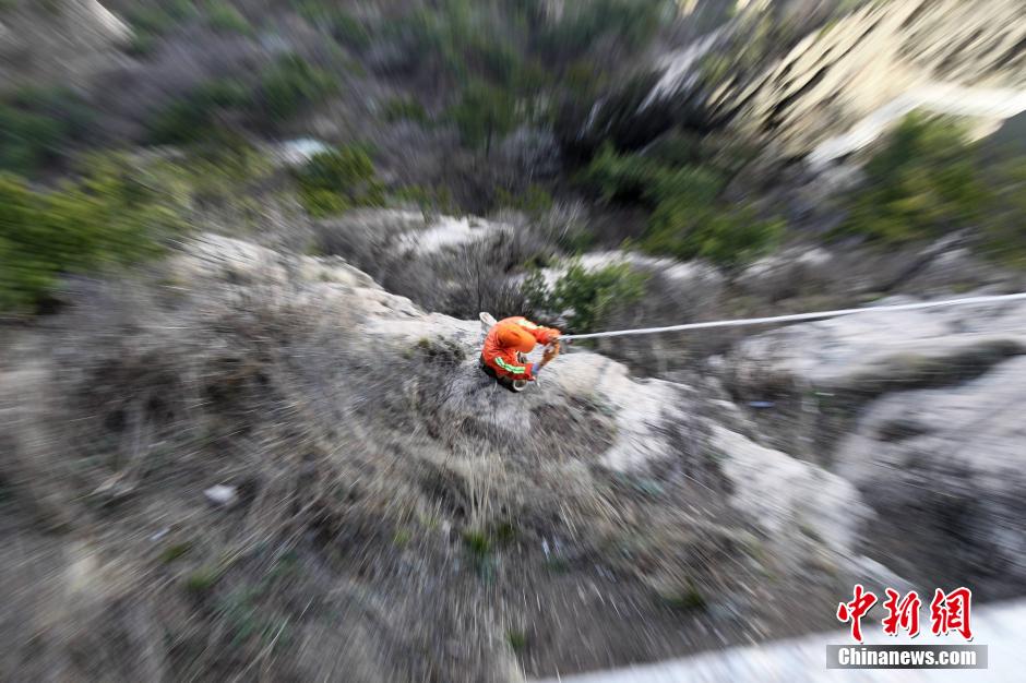 A cleaning worker collects garbage on precipice in wind in Laojunshan Mountain of Luoyang, central China’s Henan province on April 16, 2015. Having a rope tied on the waist, the worker climbed under a suspended plank road 2000 meters high, just like a Spider Man. (Chinanews/Wang Zhongju)