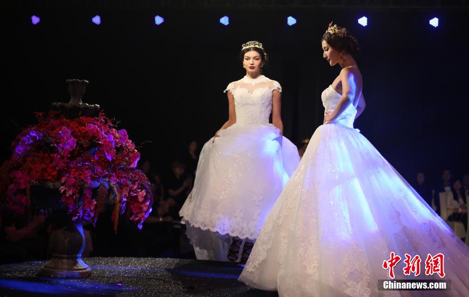 Models dressed in trendy wedding dresses perform a spectacular wedding show in a hotel in Nanjing. (Chinanews/Yang Bo)