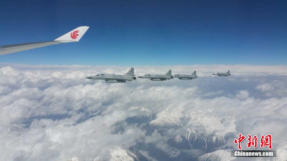 | Eight JF-17 Thunder fighter jets from Pakistani Air Force escort Chinese President Xi Jinping's plane as it enters Pakistani air space on Monday, April 20, 2015. (CNS/Ouyang Kaiyu) |