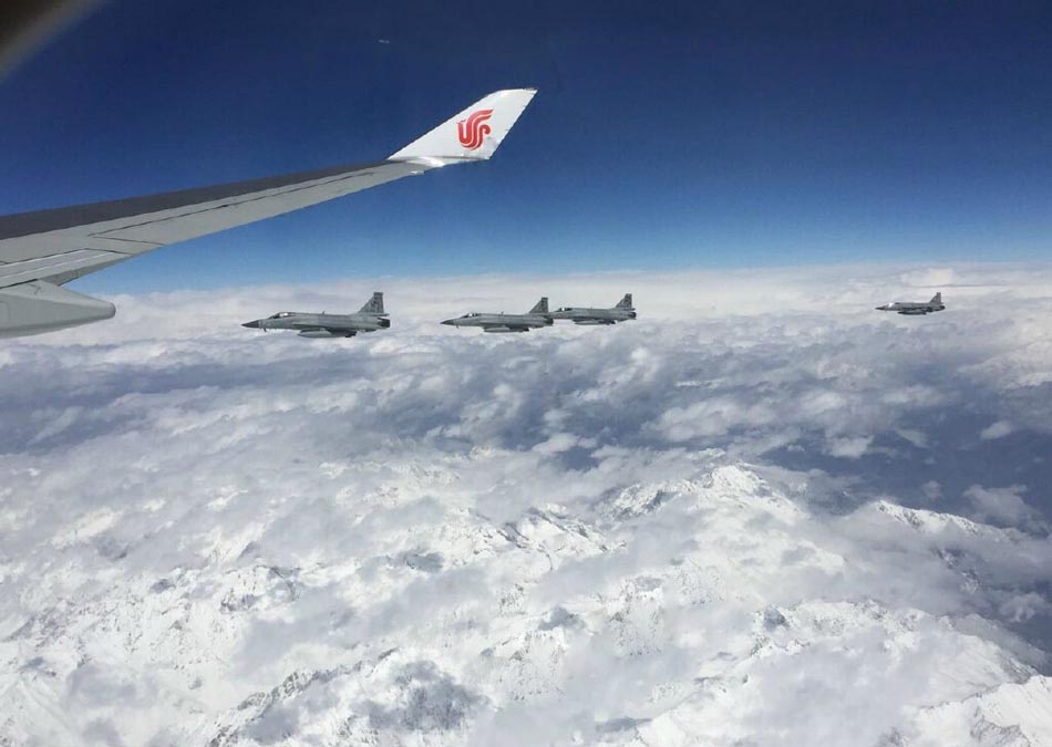 Eight JF-17 Thunder fighter jets from Pakistani Air Force escort Chinese President Xi Jinping's plane as it enters Pakistani air space on Monday, April 20, 2015. (CCTV/Wang Yingbo)