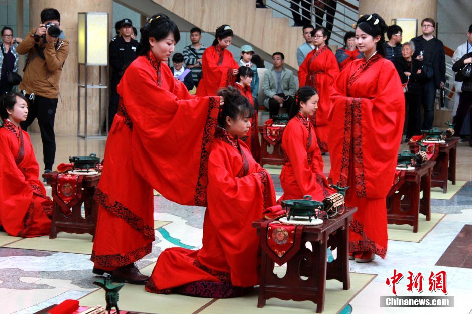Girls participate in a female adult ceremony in Xi'an, capital city of northwestern China's Shaanxi Province on April 18, 2015. Wearing Han costumes they bowed to teachers and parents to declare that they're grown-ups. (CNS Photo)