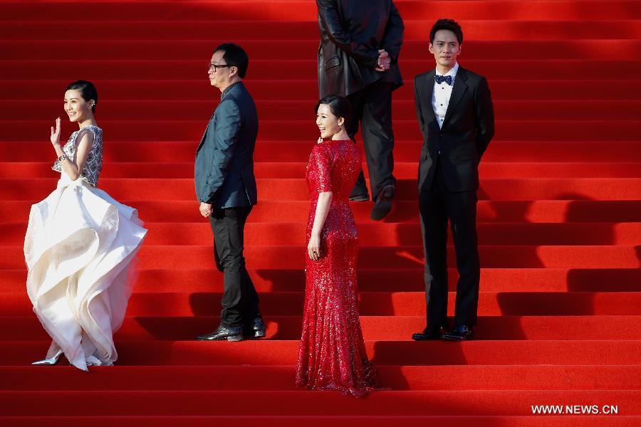 Actress Amber Kuo (1st L) of the movie "Paris Holiday" walks the red carpet during the closing ceremony of the fifth Beijing International Film Festival (BJIFF) in Beijing, capital of China, April 23, 2015. The BJIFF closed here on Thursday. (Xinhua/Shen Bohan)