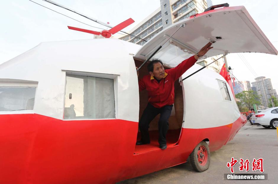 Yuan Jingying, a retired senior engineer from an aircraft factory in Henan province, spent five years developing a "helicopter". 12.5 meters high and 2.8 meters long, it is equipped with a computer-controlled central air-conditioning system. Although it has the appearance of a real helicopter, it cannot take off. Its maximum speed on road can reach 75 miles per hour. Yang said he has dreamed to use his own helicopter to carry his mother to travel across China and take and fetch his grandson. (CNS Photo)