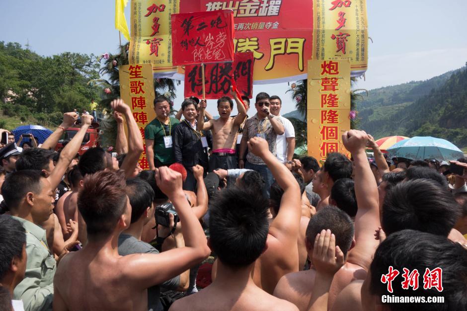 Half-naked men scramble for fireworks in Guangxi