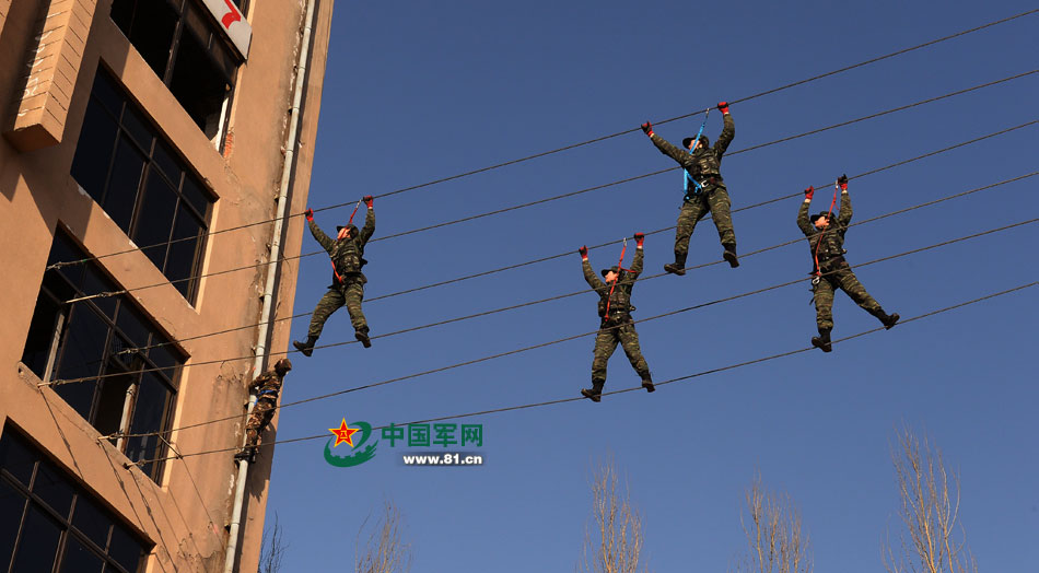 Female members walk on a 15 meters high rope to improve psychological quality on March 23, 2015. (www.81.cn/Li Jing)