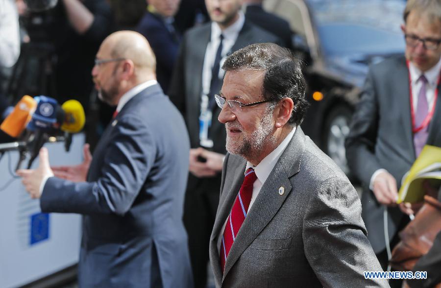 Spanish Prime Minister Mariano Rajoy arrives at the European Union (EU) extraordinary summit to discuss how to address the migratory pressures in the Mediterranean at the EU headquarters in Brussels, Belgium, on April 23, 2015. Only 28 migrants out of 700 seem to have survived by far after their boat capsized some 120 miles south of Lampedusa, Italy on Saturday night. (Xinhua/Zhou Lei)