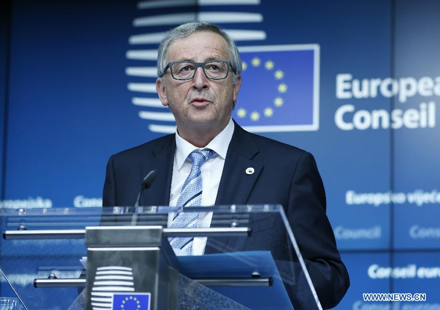 | European Commission President Jean Claude Juncker speaks during a press conference with European Council President Donald Tusk (not seen) after an extraordinary summit aiming to discuss how to address the migratory pressures in the Mediterranean, at the EU headquarters in Brussels, Belgium, April 23, 2015. Only 28 migrants out of 700 seem to have survived by far after their boat capsized some 120 miles south of Lampedusa, Italy, on Saturday night.(Xinhua/Ye Pingfan) |