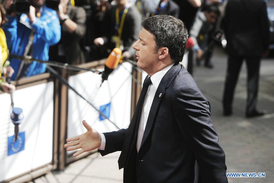 Italy's Prime Minister Matteo Renzi arrives at theEuropean Union(EU) extraordinary summit to discuss how to address the migratory pressures in the Mediterranean at the EU headquarters in Brussels, Belgium, on April 23, 2015. Only 28 migrants out of 700 seem to have survived by far after their boat capsized some 120 miles south of Lampedusa, Italy on Saturday night. (Xinhua/Zhou Lei)