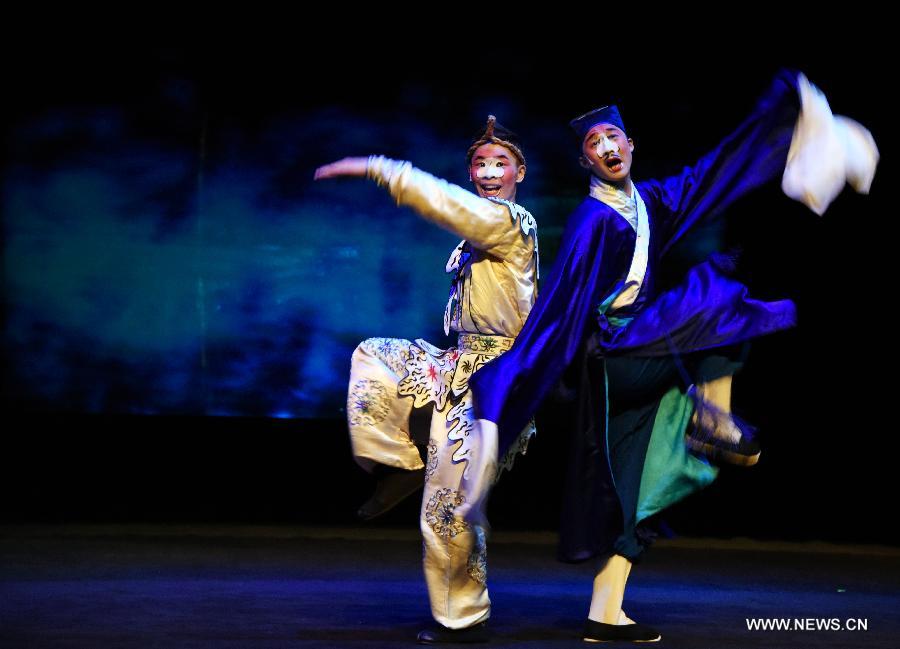 Actors perform during a rehearsal of the Peking Opera "Fantasy of Selling Ghost" at Guoguang Opera Theater in Taipei, southeast China's Taiwan, April 24, 2015. The opera will be on stage on April 25 and 26. (Xinhua/Wu Ching-teng)