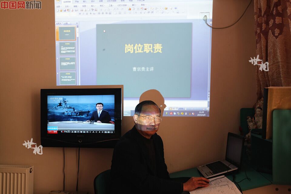 68-year-old Cao Zonggui preparing powerpoint slides for his lecture. (China.org/Fu Cun)