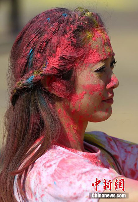 Thousands of young people participate in the five-kilometer 'Color Run' at Xuanwu Lake Park in Nanjing on April 22, 2015. (CNS/Yang Bo)