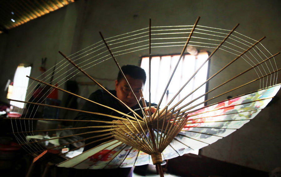 A villager frames the oiled paper umbrella. (Xinhua/Liu Xueyi)
