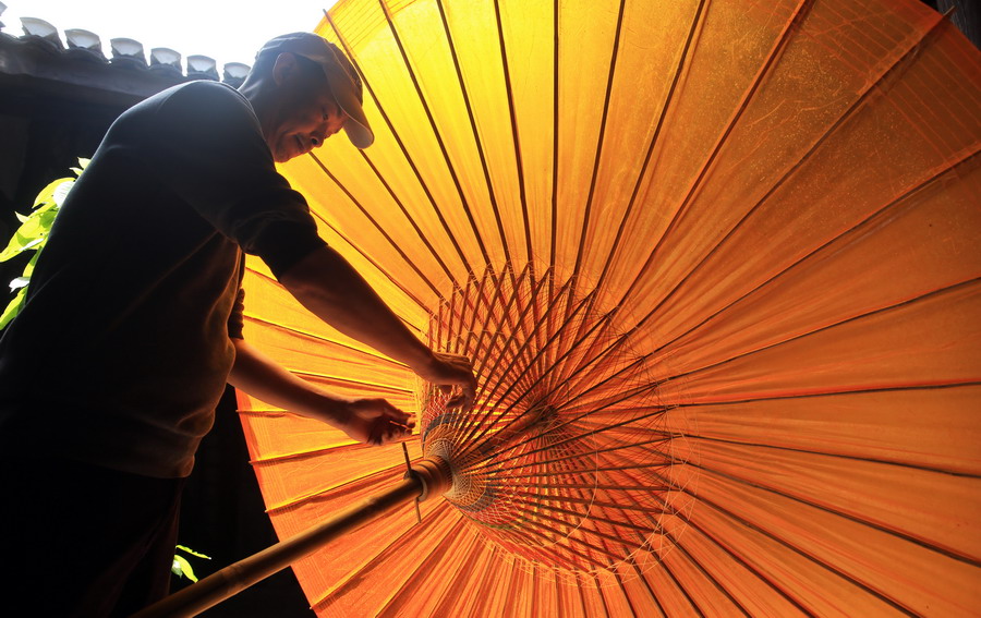 A villager makes oiled paper umbrella. (Xinhua/Liu Xueyi)