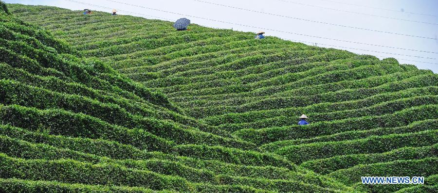 Tea farmers pick up tea leaves on a mountain in Huishui County of Qiannan Buyi Autonomous Prefecture, southwest China's Guizhou Province, April 25, 2015. Tea farmers here are busy with picking up the last batch of spring tea leaves. (Xinhua/Ou Dongqu)