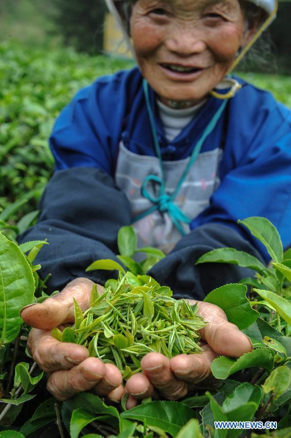 A tea farmer picks up tea leaves in Huishui County of Qiannan Buyi Autonomous Prefecture, southwest China's Guizhou Province, April 25, 2015. Tea farmers here are busy with picking up the last batch of spring tea leaves. (Xinhua/Ou Dongqu)
