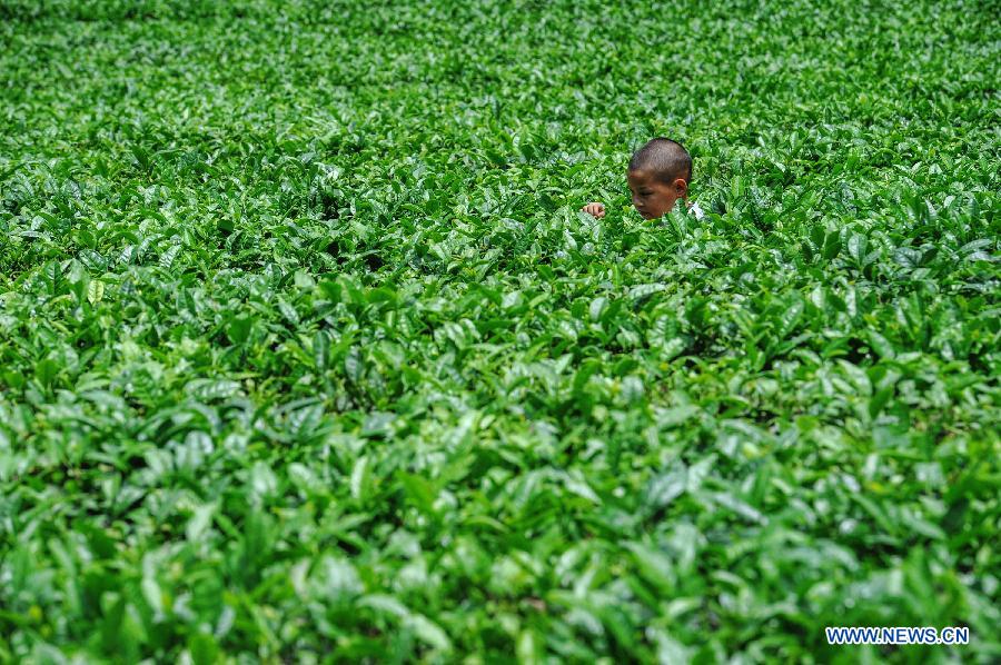 A child helps to pick up tea leaves on a mountain in Huishui County of Qiannan Buyi Autonomous Prefecture, southwest China's Guizhou Province, April 25, 2015. Tea farmers here are busy with picking up the last batch of spring tea leaves. (Xinhua/Ou Dongqu)