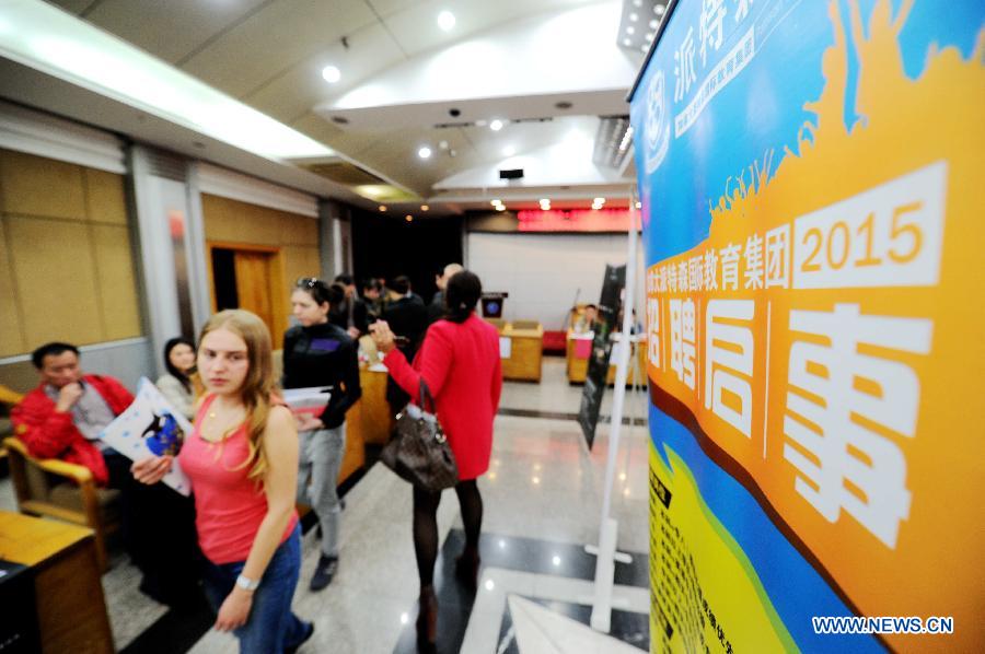 Foreign graduates talk with recruiters at a job fair especially held for foreign students in Heilongjiang University in Harbin, capital of northeast China's Heilongjiang Province, April 25, 2015. More than 200 foreign graduates from ten countries tried to find a job at the fair. (Xinhua/Wang Song)