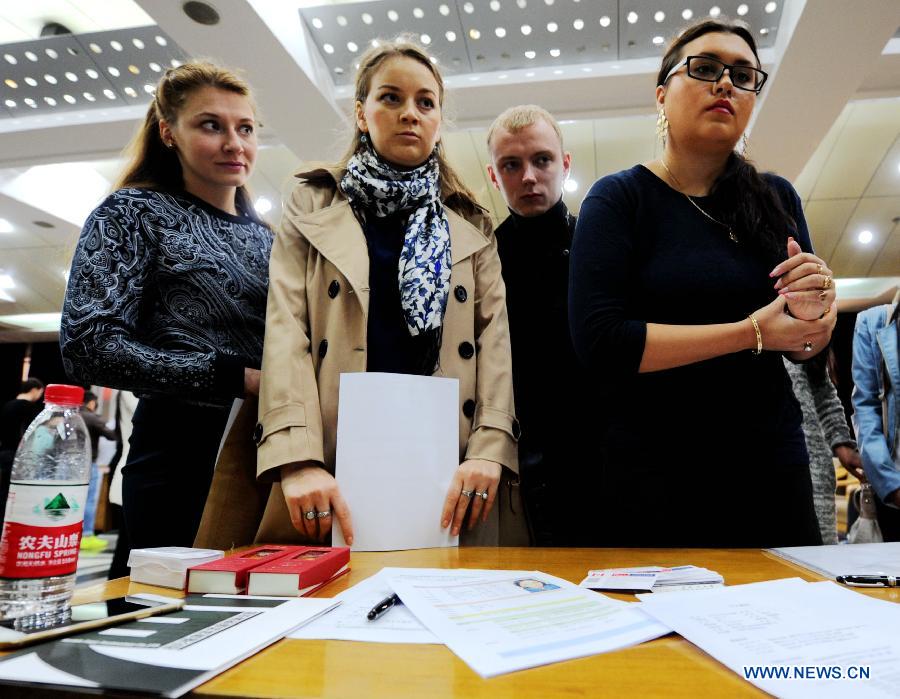 Foreign graduates talk with recruiters at a job fair especially held for foreign students in Heilongjiang University in Harbin, capital of northeast China's Heilongjiang Province, April 25, 2015. More than 200 foreign graduates from ten countries tried to find a job at the fair. (Xinhua/Wang Song)