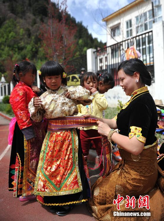 A teacher helps a girl with her clothing. (Chinanews/Liu Zhongjun)