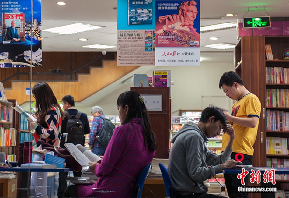 Readers stream in and out in Sanlian Bookstore in Beijing on April 22, 2015. People enjoy reading at night in this 24-hour bookstore. (CNS/Li Qing)