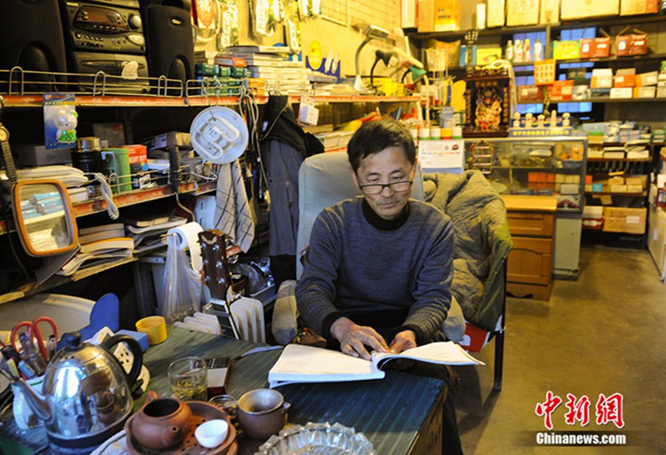 Zhang, the owner of a hardware store in Beijing, loves reading and carries books with him when he goes to the toilet. (CNS/Li Qing)