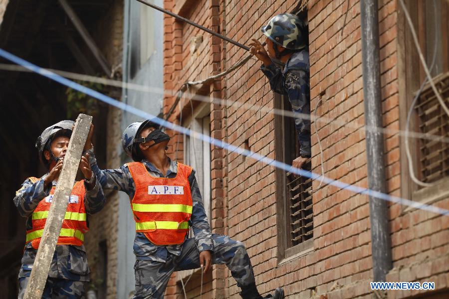 Members of the Nepalese Armed Police Force try to rescue people stuck in houses in Bhaktapur, Nepal, April 26, 2015. A total of 3,218 people were killed and about 6,500 others injured in the powerful earthquake that struck Nepal on Saturday, the authorities said April 27. (Xinhua/Pratap Thapa)